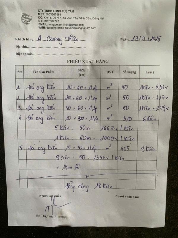 Phiếu giao hàng có ghi đầy đủ số lượng, mã hàng, loại đá, quy cách đóng gói.