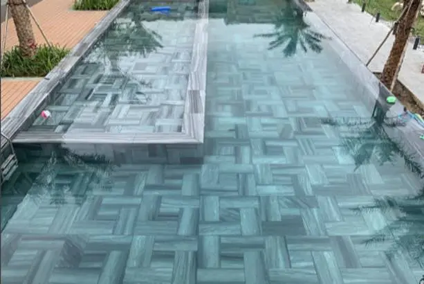 Kiểu lát đá sọc dưa hình xương cá khá độc đáo, được nhiều gia chủ hay lựa chọn để tạo điểm nhấn cho không gian. Chúng ta thường thấy những kiểu ốp gạch trang trí tường hình xương cá thường sẽ thu hút hơn so với kiểu ốp thẳng truyền thống nên khi đá sử dụng sọc dưa lát hồ bơi thì kiểu lát này cũng khá được ưa chuộng.